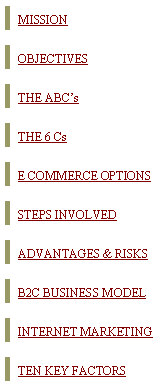 MISSION | OBJECTIVES | THE ABC’s | THE 6 Cs | E COMMERCE OPTIONS | STEPS INVOLVED | ADVANTAGES & RISKS | B2C BUSINESS MODEL | INTERNET MARKETING | TEN KEY FACTORS